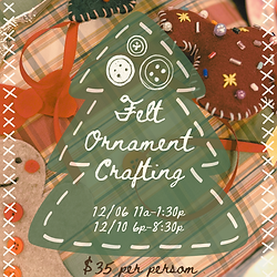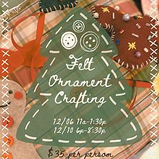 Welcome to the class where we take felt, beads, buttons, and pure unhinged creativity and turn them into ornaments your friends will swear you bought at Anthropologie (but like… if Anthropologie knew everything about your style, obvi). You’ll start with 10 original ornament shapes that we've designed in-house—because we’re fancy like that—and then raid our gloriously extra stash of colored felt, fabric scraps, beads, sequins, buttons, ribbons, embroidery thread/floss (yes, both, because we’re thorough), and fluffy stuffing. Basically, if it can be sewn onto felt, we probably have it in a bin. And, hells yeah, your ornament can be whatever style your fabulous heart desires: Traditional? Cute. Anthropologie-coded? Stunning. Mid-century? Werk. Full glam disco-ball energy? Say no more. Never sewn anything besides your wild oats? Great. We'll show you a couple of basic stitches that’ll make you feel like a wholesome Pinterest icon and just a touch domestic- and we'll be right there helping you cut, decorate, stitch, and stuff your little masterpiece from start to finish. The Details $35 per person 2.5 hours of chaotic good crafting energy Want more? Make extra ornaments for $15 each (because once you start, it’s a problem and we enable that). Perfect for girl gang outings, date nights, solo “treat yourself” evenings, and anyone who believes holiday décor should be personal, fabulous, and maybe a little unhinged. Come make something adorable. Your tree deserves some drama this year.